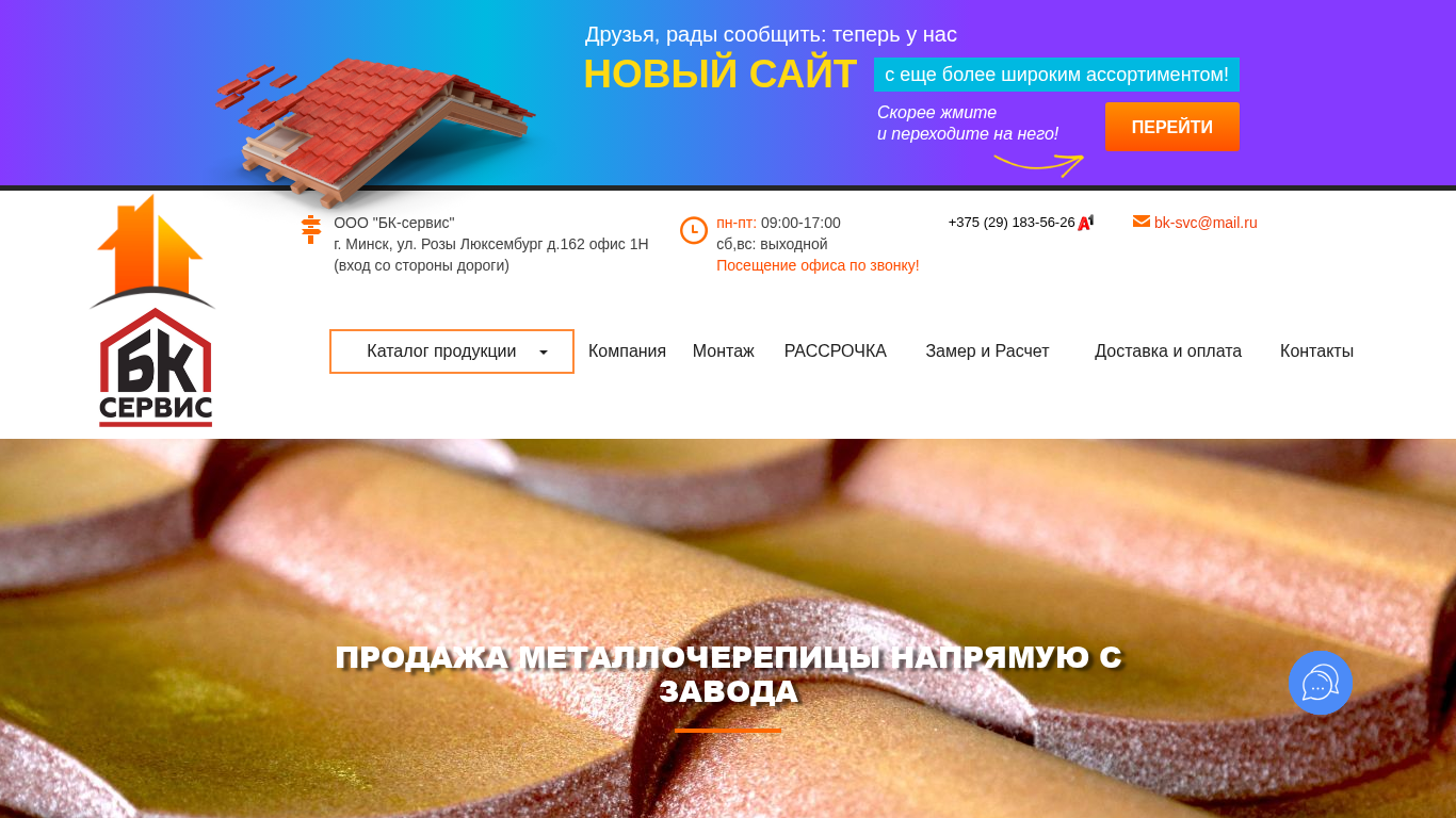 | SEO-описание | ООО БК-сервис предлагает купить в Минске металлочерепицу, профнастил, металлосайдинг, гидроизоляционные пленки и мембраны. Выезд замерщика. Расчет материалов. 50% предоплата. Рассрочка. Доставка. |