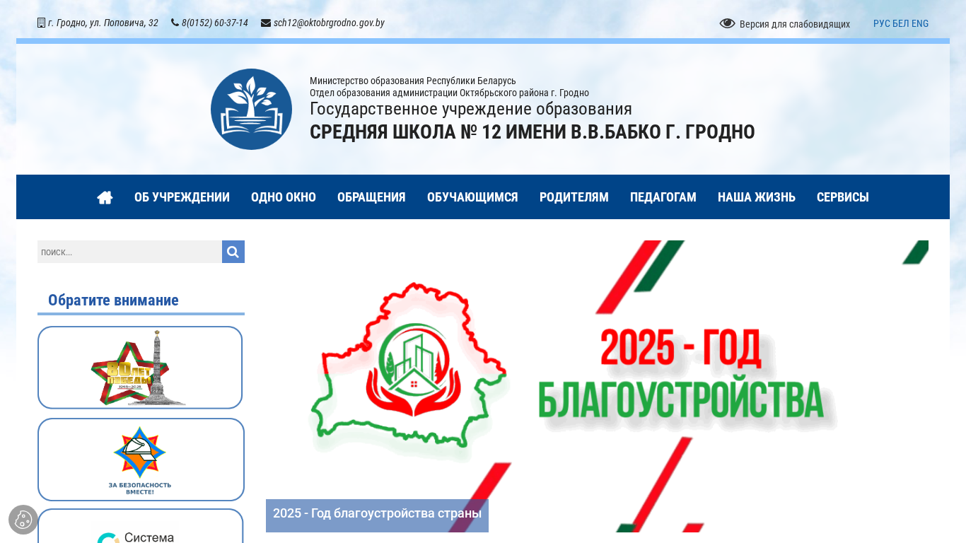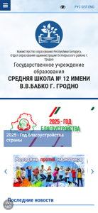 | AI-анализ | This online resource represents the official website of Middle School No. 12 named after V.V. Babko in Grodno, Belarus. The site provides information about the school, its history, leadership, structure, and various educational and extracurricular activities. Keywords associated with the website include 'school', 'Grodno', 'education', 'Belarus', 'ministry', 'safety', and 'Babko'. The website also features a school newspaper called 'RITM', a resource center, and information on administrative procedures and required documents. The school focuses on creating a productive, safe, and development-oriented environment. Various initiatives are in place to ensure a healthy lifestyle, prevent corruption, protect children, and promote patriotism. The site includes contact information and a rating portal. The higher education authority is the governing body, and the website facilitates electronic applications and |