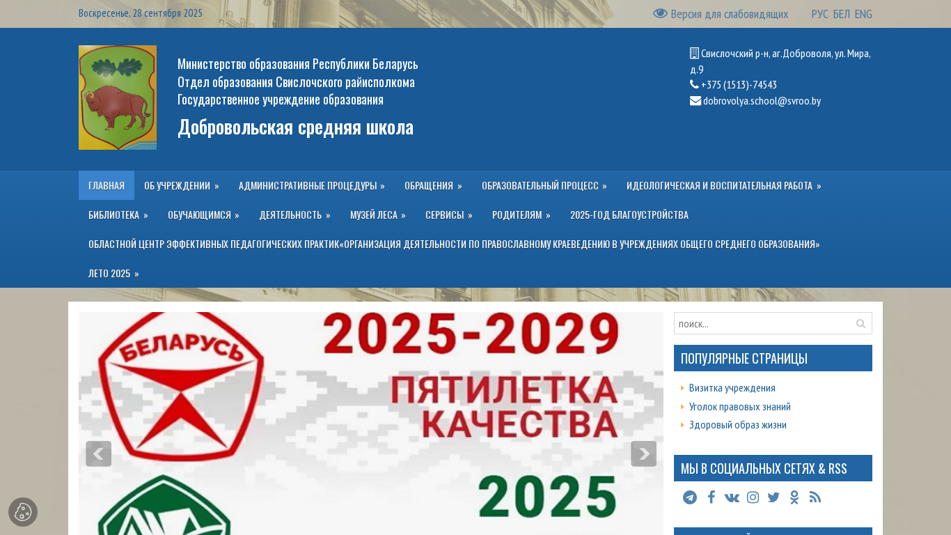 | AI-анализ | The web project "Добровольская средняя школа" (Dobrovolskaya Srednyaya Shkola) is the official website of a public educational institution located in the village of Dobrovolia, Sviслоchsky district, in Belarus. The site provides information about the school, its mission, structure, and educational offerings. Keywords associated with the website include "education," "school," "Belarus," "Republic," and "news." The site includes sections on the history of the school, its leadership, academic programs, and extracurricular activities. Users can also find information on administrative procedures, contact information, and various policies and regulations. The website is operated by the Ministry of Education of the Republic of Belarus and the Sviслоchsky district educational administration. |