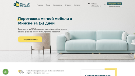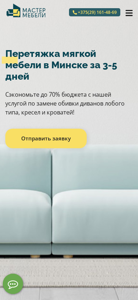 | AI-анализ | --- The portal Mastermebelitut.by offers furniture repair and upholstery services in Minsk and the Minsk region. Prices for upholstery work are given, and repairs can be completed within 2-6 days, with a 18-month work guarantee. Services include the reupholstering of sofas, chairs, or stools, as well as carcass and mechanism repairs. The company operates from its own equipped workshop and offers express repair services on site. Customers can contact the company at +375(29) 161-48-69 for a quote or to schedule a consultation with a master. The website provides examples of completed work and lists prices for various furniture items without including the cost of materials. Furniture items that can be repaired include a sofa-bed, Euro-style sofa, accordion sofa, corner sofa, |