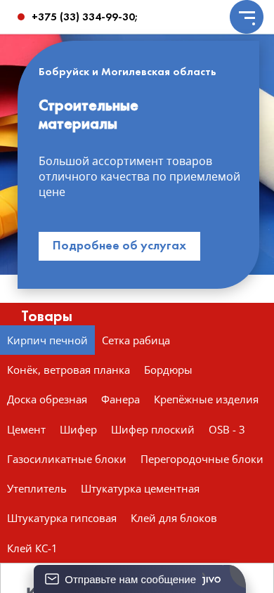 | AI-анализ | This online resource is dedicated to selling building materials in Bobruisk and the Bobruisk region at low prices. It offers a wide range of high-quality products. The phone number is provided for inquiries and there are discounts available. The website is located in Bobruisk, Orджоникидзе Street 99, 1st floor. The main menu includes 'Home', 'Advantages', 'Products', 'Contacts' and 'Bobruisk and Mozyr Region Building Materials'. The website offers a large selection of building materials including bricks, cement, gypsum, roofing materials, and more from the Republic of Belarus at affordable prices. Customers can place an order for items such as fire brick, wire mesh, roofing material, and more. The website provides information on the production and cost of items such as fire brick, wire mesh, roofing material |