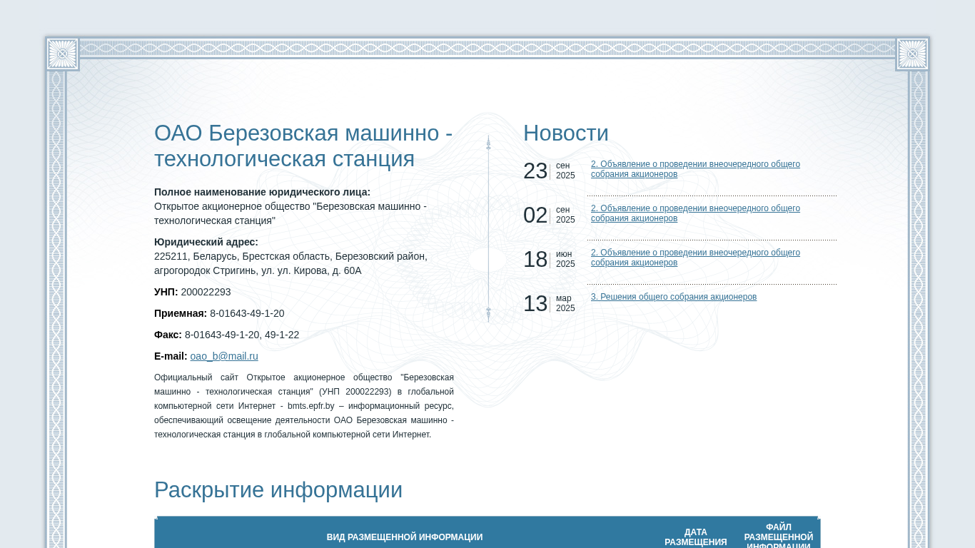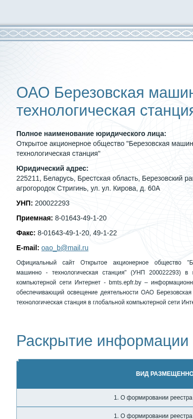 | AI-анализ | The website bmts.epfr.by is the official online resource of Open Joint Stock Company "Berezovskaya Machino-Technological Station" (UNP 200022293). It provides information about the company's activities in the global computer network Internet. The website features announcements of shareholders' meetings, including in-between regular ones, as well as the resolutions made during these meetings. Additionally, the site offers downloadable documents such as the shareholder register, annual reports, and related notices. The domain is registered to the State Enterprise "Electronic Document and Information System" in Belarus. |