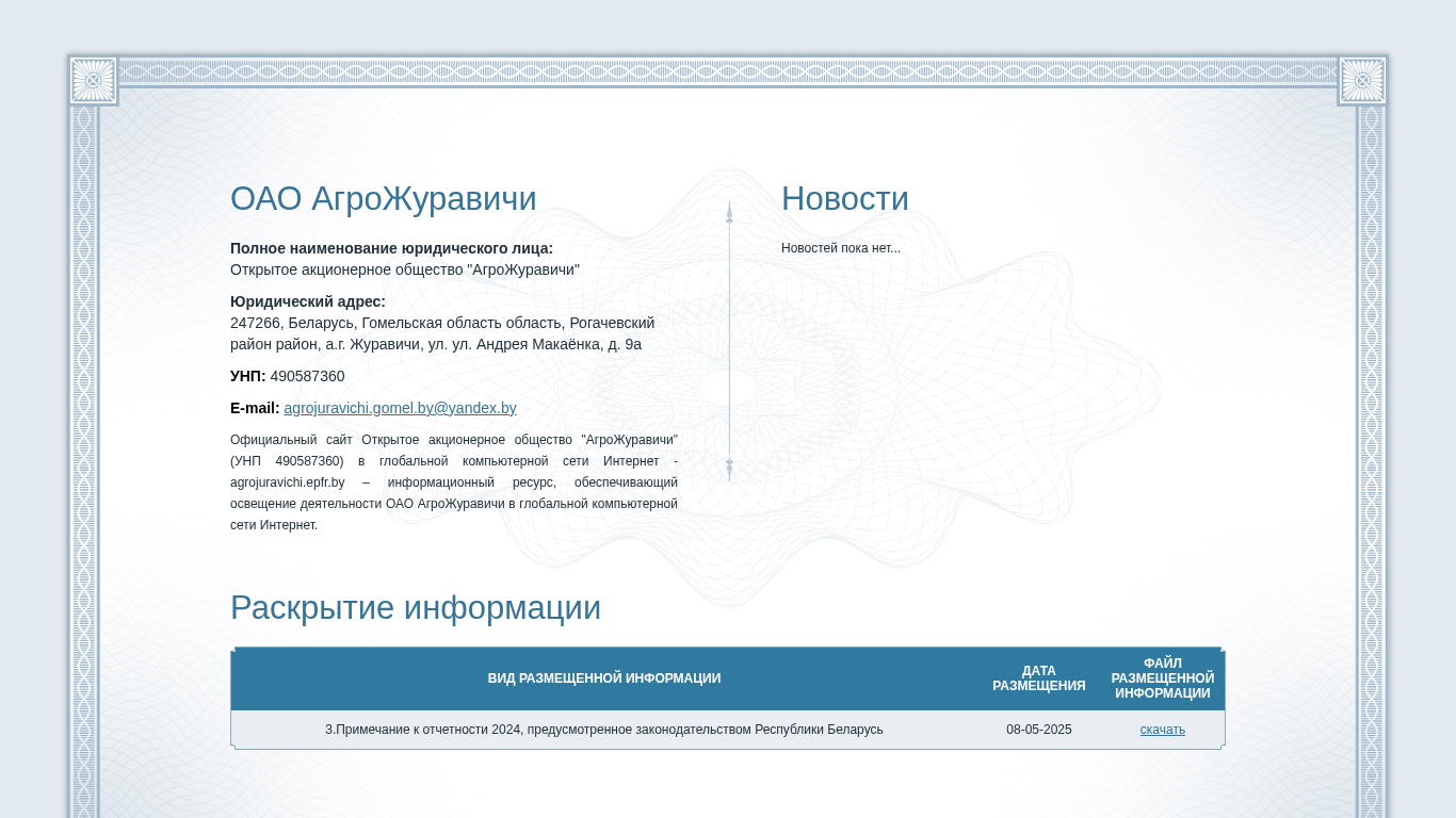 | AI-анализ | The web project "АгроЖуравичи ОАО" is an informational resource for Open Joint Stock Company "АгроЖуравичи" (UCP 490587360) in the global computer network Internet. The website, located at agrojuravichi.epfr.by, provides information on the activities of the company, including its legal name, address, and UNP number. The website also includes a login page for accessing a personal cabinet, and a registration form for new users. The site is developed by epfr.by. As of May 8, 2025, there are no news articles available on the site. The website is registered with the domain agrojuravichi.epfr.by. |