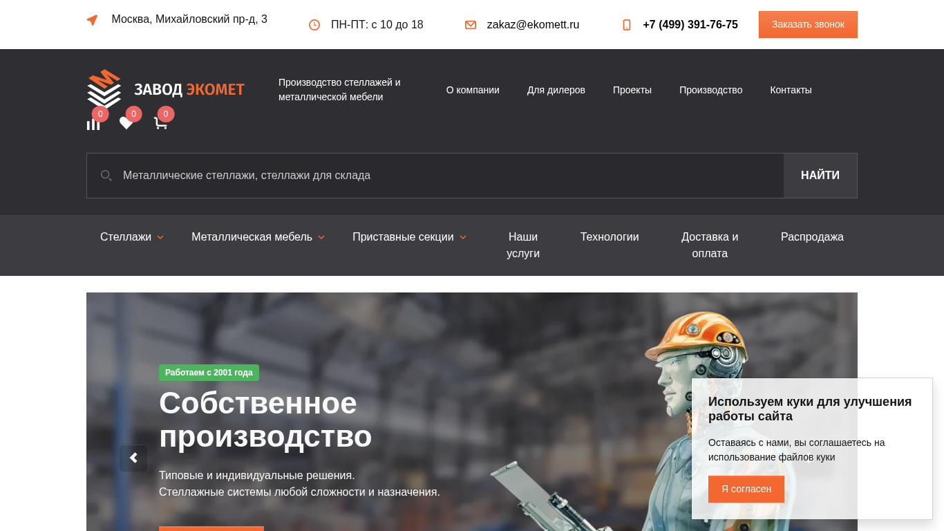 | SEO-описание | Завод «ЭКОМЕТ» — производство металлических стеллажей и мебели в Москве. Изготовление стеллажей на заказ по размерам заказчика. Собственное производство, расширенная гарантия и быстрая доставка по всей России. Звоните +7 (499) 391-76-75 |
