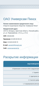 | AI-анализ | The portal Universam Pinsk OAO is a corporate website for the Open Joint Stock Company Universam Pinsk. It provides information on the company's annual general meetings and their resolutions, as well as financial reports and auditor's conclusions. The site includes downloadable documents for annual reports, auditor's reports, and dividend payments from 2021 to 2025. The company's full legal name is Open Joint Stock Company Universam Pinsk, and its legal address is in Pinsk, Belarus. The site's contact information includes a phone number, fax number, and email address. The domain name is universampinsk.by. |