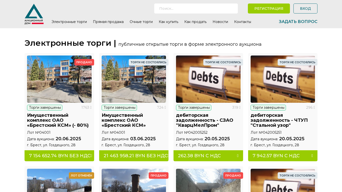 | SEO-описание | Сайт электронных торгов Аукционный дом – это площадка единой системы электронных торгов онлайн в Беларуси. У нас можно купить и продать через аукцион недвижимость, транспорт, спецтехнику, бизнес, оборудование и многое другое |