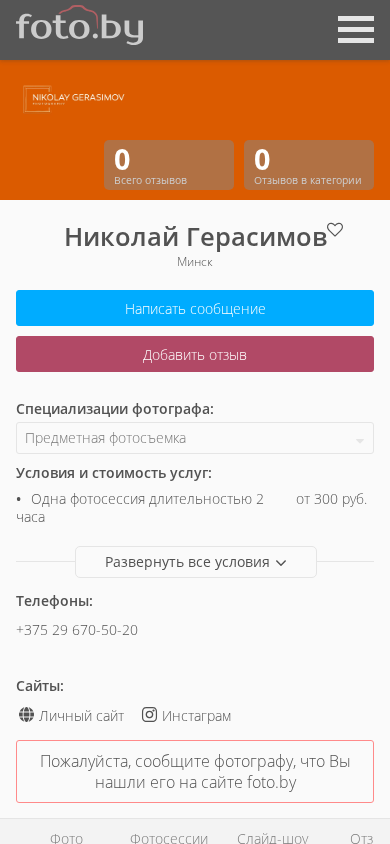 | AI-анализ | --- The web project "Фотограф Николай Герасимов, Минск" is a photography website showcasing the works of Nikolay Gerasimov, a photographer based in Minsk, Belarus. The site primarily features photographs in the category "Предметная фотосъемка" (Subject Photography). Visitors can find information about Nikolay's services, pricing, and contact details. The site also includes a community section for users to leave reviews and view other photographers' works. The main categories of photography offered include food, product shots for marketplaces, and various other subjects. The website is available in both Russian and Belarusian languages. |