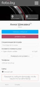 | AI-анализ | The website belongs to food photographer Anna Shikavka from Minsk, Belarus. The site features photographs in the 'Food (фуд) photo sessions' category. Anna Shikavka offers her photography services in cities such as Minsk, Logoisk, Zhodino, Molodechnno, Borisov, Zaslavl, Vitebsk, Polotsk, Soligorsk, Vileyka, Lida, Bobruisk and others. Keywords associated with the site include 'food', 'photo sessions', 'photographer', 'Anna Shikavka', 'categories', 'marketplaces', 'interiors', and 'reviews'. The site also includes a community for photographers and a blog. The photographer specializes in food photography, as well as photography for marketplaces and interiors. Pricing for one photographic object |
