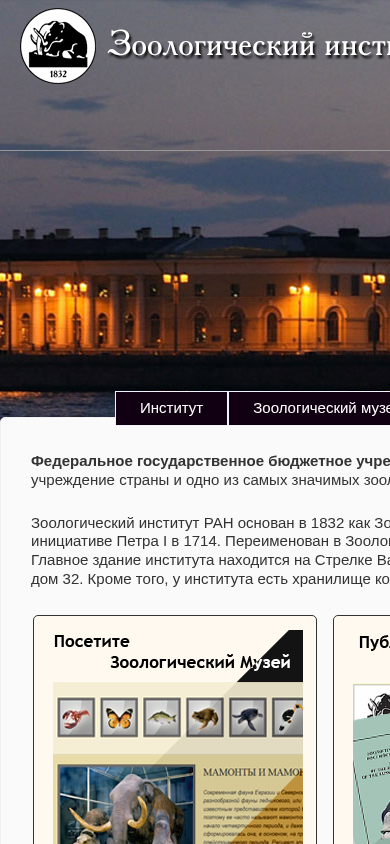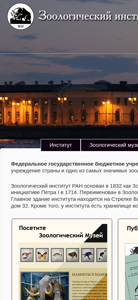 | AI-анализ | language: ru country: RU type: organization The website is for the Zoological Institute of the Russian Academy of Sciences (ZIN RAN), a leading zoological research institution in Russia and one of the most significant zoological institutions globally. Founded in 1832 as the Zoological Museum of the Imperial Academy of Sciences, it grew from the zoological collections of the Kunstkamera, initiated by Peter the Great in 1714. Renamed as the Zoological Institute in 1931 during the Soviet Academy of Sciences reform, the institute's main building is located on Vasilyevsky Island, University Embankment, house 1. A second building is situated on English Prospect, house 32. Additionally, the institute has a collection storage on Zapovednaya Street, house |