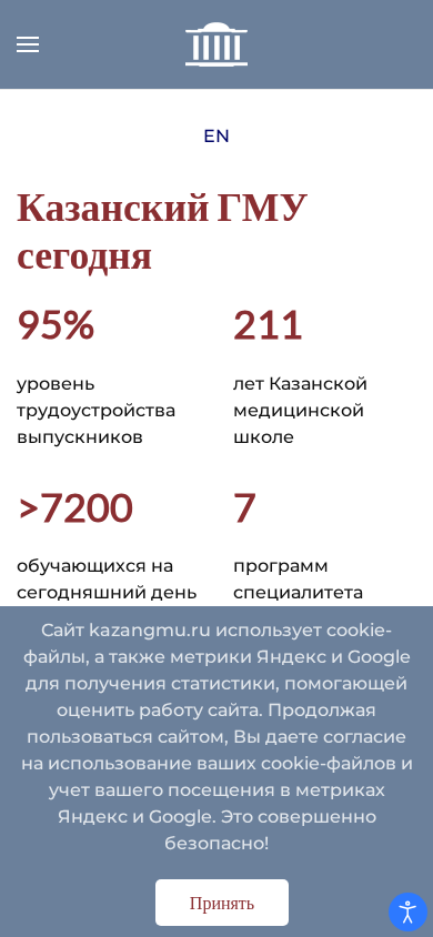 | AI-анализ | This website is the official site of the Kazan State Medical University (Государственный медицинский университет Казань, gosudarstvennyy meditsinskij universitet Kazan'). It provides information about news, events, and conferences related to the university. Keywords include 'Казанский' (Kazan'), 'обучение' (education), 'программы' (programs), 'информация' (information), 'контакты' (contacts), and 'научно-исследовательская' (research). The university's mission and values, documents, and contact information are also accessible. Various centers and laboratories, such as the Scientific Research Laboratory "Intellectual Technologies in Medicine" and the Digital Education and Healthcare Research and Development Center, are mentioned. The university offers medical |