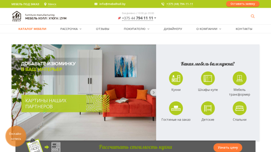 | AI-анализ | This online resource is for a custom furniture company named Мебель Холл based in Minsk, Belarus. The company specializes in the production of custom-made furniture, particularly corpus furniture, according to individual projects. Their offerings include kitchens, built-in cabinets, and children's furniture. Keywords associated with the website include 'mebelholl', 'мебель' (Russian for 'furniture'), 'заказ' ('order'), 'кухни' ('kitchens'), 'проект' ('project'), and 'минск' ('Minsk'). The website provides contact information, including a telephone number and email address, for customers to place orders or leave inquiries. The catalog includes various categories of furniture, such as kitchens, living room furniture, children's furniture, and office furniture, with options for materials, styles, and prices. |