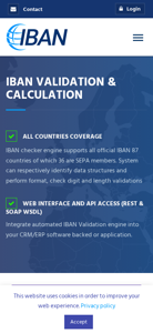 | AI-анализ | This website, titled "IBAN Checker: International Bank Account Number validation," is a platform that offers software designed to validate an International Bank Account Number and identify the bank owning this account, BIC code, and address. The website's description mentions it as an IBAN checker, emphasizing its function for validating and checking IBAN numbers. The keywords associated with the site include "iban," "checker," "validate," "bic," and "mod97," among others. Top_words indicate that the website is primarily about IBAN, bank, validation, and Euro. The website provides access to various services such as IBAN validation and calculation, BIC validation, UK bank account validation, and more. It supports all official IBAN 87 countries, including SEPA members, and offers both web interface and API access for integration into CRM/ERP software. |