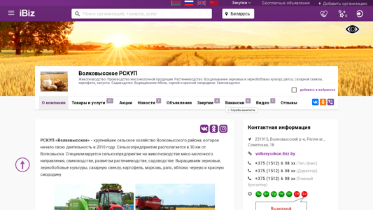 | AI-анализ | The website is for Волковысское РСКУП, a farm in Belarus specializing in livestock production, particularly in meat and dairy products, as well as crop farming, with a focus on grains, rapeseed, sugar beets, potatoes, cabbage, and fruits such as apples and black and red currants. The farm also raises pigs. The website includes information about the company, its products, and offers for sale, with categories for livestock, grains, animal feed, rapeseed oil, vegetables, and fruits. The farm has around 6,630 head of cattle, including 2,220 milking cows, and over 18,600 pigs. The daily weight gain for young cattle is 669 grams, and for pigs, 600 grams. The farm also maintains |