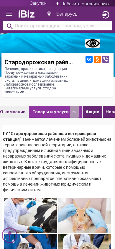 | AI-анализ | The portal <b>Stadrorogi-vet.ibiz.by</b> is a veterinary station that provides treatment, prevention, and vaccination for cattle, fur animals, and domestic animals. It offers laboratory research and veterinary services, as well as animal care. The organization is located in Starye Dorogi, Kirovskaya oblast, Belarus, at the address: 222932, Kirova, 155. Services include ambulatory care, vaccination, administration of medicines, blood collection, ear tag installation, vitaminization, deworming, carcass inspection, export certificate issuance, castration, wound treatment, claw trimming, parasite control, veterinary certificate issuance, gynecological treatment, and assistance during births. Veterinarians, who are part of the team |