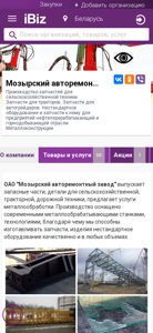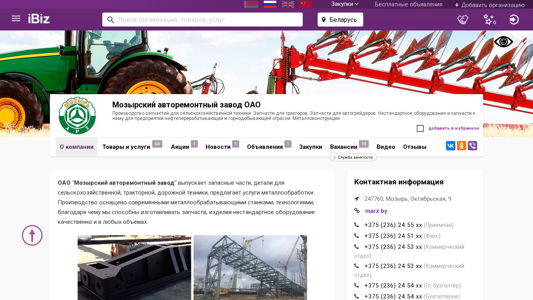 | AI-анализ | The website is for "Мозырский авторемонтный завод ОАО" (Mozirsky Avtomatarny Zavod OAO), a manufacturer and seller of spare parts and equipment for agricultural, tractor, and road machinery, as well as specialized and industrial equipment. The company offers metalworking services and produces custom non-standard equipment for industries in the oil and mining sectors, as well as metal structures. The website is part of the iBiz search engine platform and includes sections for company information, products and services, news, and job vacancies. |