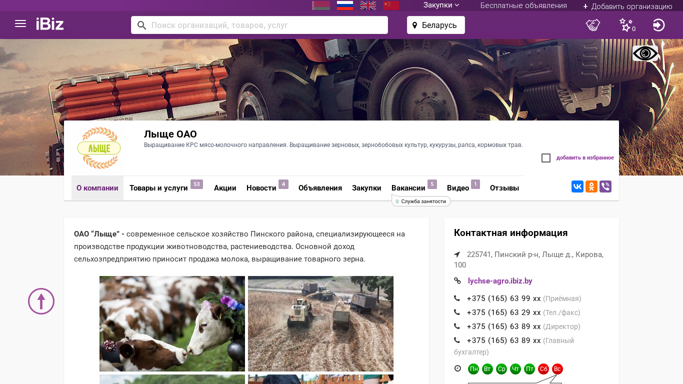 | AI-анализ | The website is for LYSCHe OAO, a Belarusian agricultural company focusing on livestock farming for meat and dairy production, and cultivation of various crops including grains, legumes, corn, rapeseed, and fodder plants. The site provides information on their product offerings, which include milk, beef, grains, legumes, corn, rapeseed, and animal feed. The company also features production facilities, transport fleet, repair workshops, grain dryers, dairy and livestock farms, agricultural lands, and storage facilities. LYSCHe OAO guarantees high-quality agricultural produce, competitive prices, and good service, and welcomes inquiries. The website includes a map for directions, contact phone numbers, and the address of the company. Keywords: LYSCHe, agriculture, livestock, farming, meat, d |