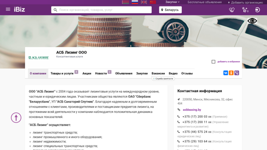 | AI-анализ | This online resource is the official website of АСБ Лизинг ООО, a consulting services company located in Minsk, Belarus. The site provides information about the company's address, contact phone numbers, and location scheme. АСБ Лизинг ООО has been offering leasing services since 2004 to private and corporate clients, including Belarusbank and ASB Sanatorium Sputnik. The company's success is attributed to its long-term relationships with clients, producers, and suppliers. Services offered include leasing of transportation vehicles, industrial and other equipment, real estate, special transportation vehicles, and international leasing for both individuals and corporations. The site emphasizes transparency, with no hidden commissions or payments, and provides a comprehensive range of related services. Keywords: ASB Лизинг, leasing services, transportation vehicles, industrial equipment, real estate, special |