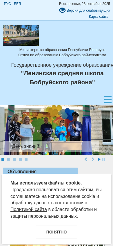 | AI-анализ | The portal lenina.bobruisk.edu.by is a website for Leninskaya Srednya Shkola (Lenin Middle School) located in Bobruisk District, Belarus. The title and description suggest that it's an educational institution, likely for secondary students. The top_words indicate that there are sections for news, organization, and possibly cafeteria or food-related information. Keywords include 'school', 'middle', 'Bobruisk district', and 'education'. The most frequently used words are 'Leninskaya', 'srednya', 'shkola', 'Bobruyski', 'raion', 'obrazovaniya', 'shkola', 'raboty', 'uchastsykh', 'novosti', 'nskaya', and 'den' with 'сентября' appearing as the sixth most frequent |
