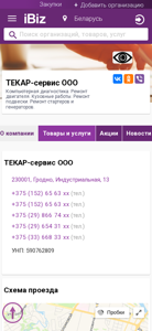 AI-анализ | This website is for Tekar-servis OOO, a company located in Grodno, Belarus, at Industriальная street 13. The website provides information about the organization, including its address, contact numbers, and a map for directions. Tekar-servis specializes in computer diagnostics, engine repair, bodywork, suspension repair, and starter and generator repair. The company's services are available Monday to Saturday from 9:00 AM to 6:00 PM, without lunch breaks. The website also includes a section for user reviews and a contact form for inquiries. The domain is registered under the iBiz media organization. |