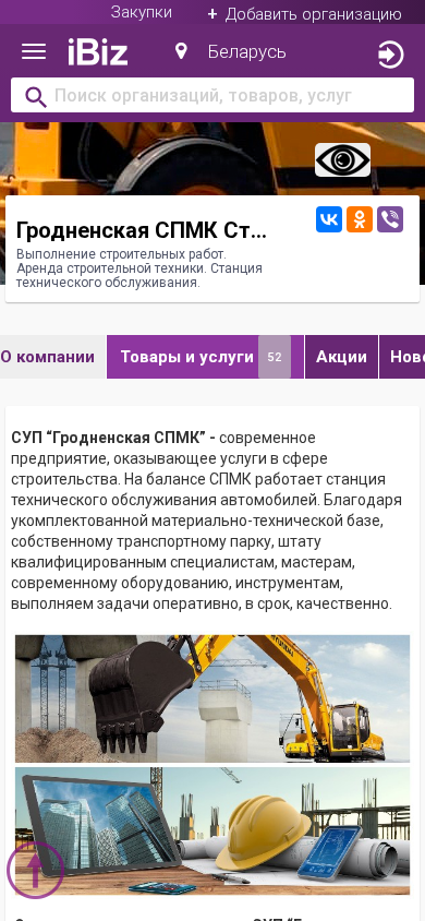 | AI-анализ | This online resource is dedicated to "Гродненская СПМК" (Grodno SPMK), a building construction company in Grodno, Belarus, offering services in building construction, rental of construction equipment, and technical service station. The company's address is on Ozerское shosse 20B, and it includes a station for vehicle technical service. The website provides information on the company's activities, which include construction works, rental of construction equipment, and technical service station. The company prides itself on its modern equipment, qualified personnel, and ability to complete projects on time, in budget, and to a high standard. The main areas of business for SPMK are construction works, rental of construction equipment, and technical service station. The company continues to expand its operations and take on new projects and activities. The website includes a map for directions and contact information. Keywords: construction, |