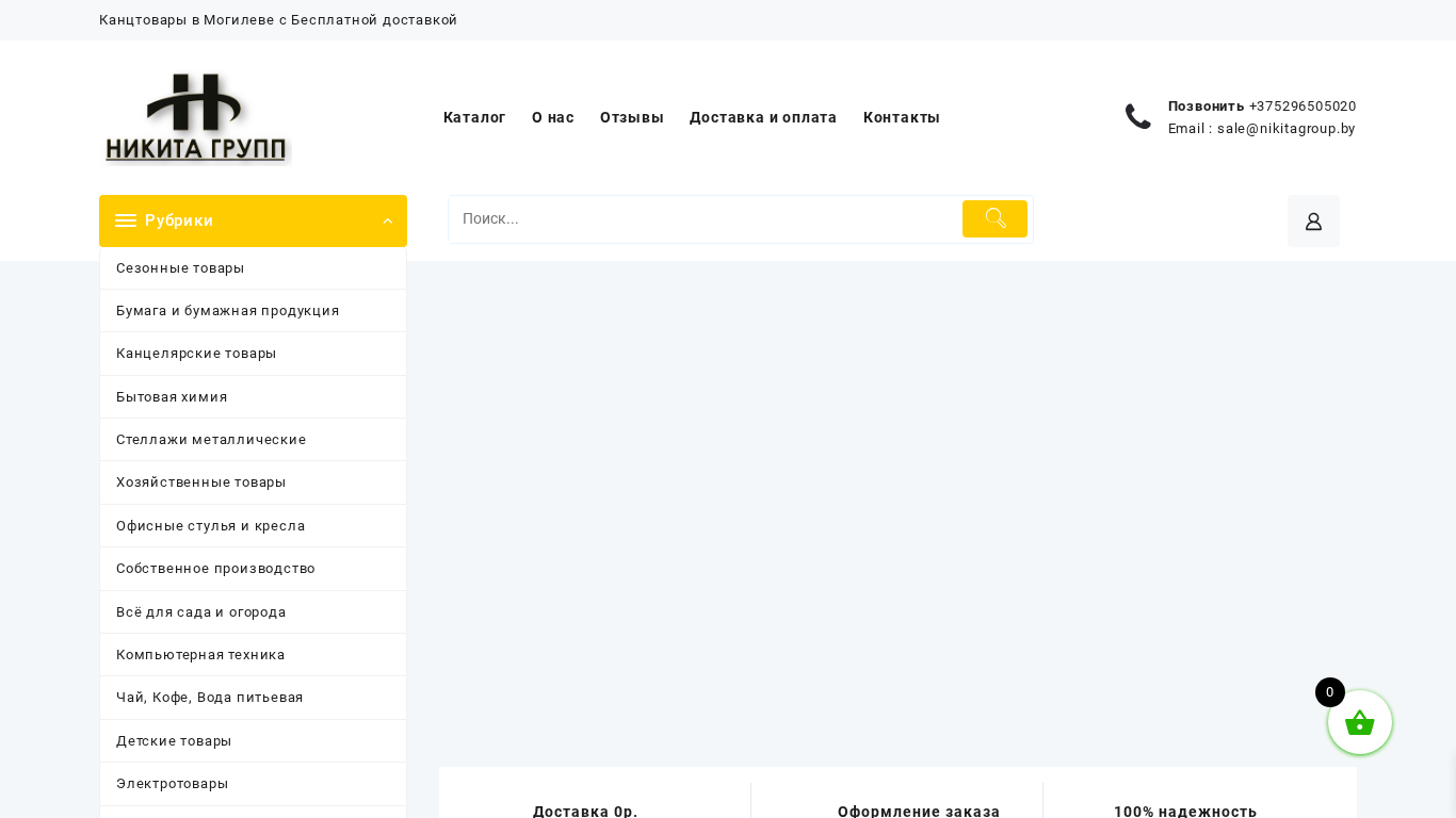 | SEO-описание | Никита Групп доставка канцелярских товаров по Могилеву, Могилёвской, Витебской, Минской и Гомельской области. Бытовая химия, офисная бумага, хозтовары, товары для школы |