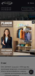 | AI-анализ | The web project "ООО Белхол: официальный саit of Belhol in Mолодечно" is the online presence of a Belarusian metalworking company, OOO Belhol, located in Mолодечно. The site features a menu with phone numbers for inquiries and leaving requests, as well as a section for services offered, including metalworking and polymer coating. The company, established in 1994, specializes in the production and provision of services in the field of metalworking, including metal items made by cold stamping, metal coating with epoxy polyether powders and water-soluble enamels, fittings for residential and industrial refrigeration equipment, and tubular products for shopping centers, exhibition pavilions, residential buildings, and offices. The company boasts experienced and qualified staff, short production turnaround times, and advanced equipment. |