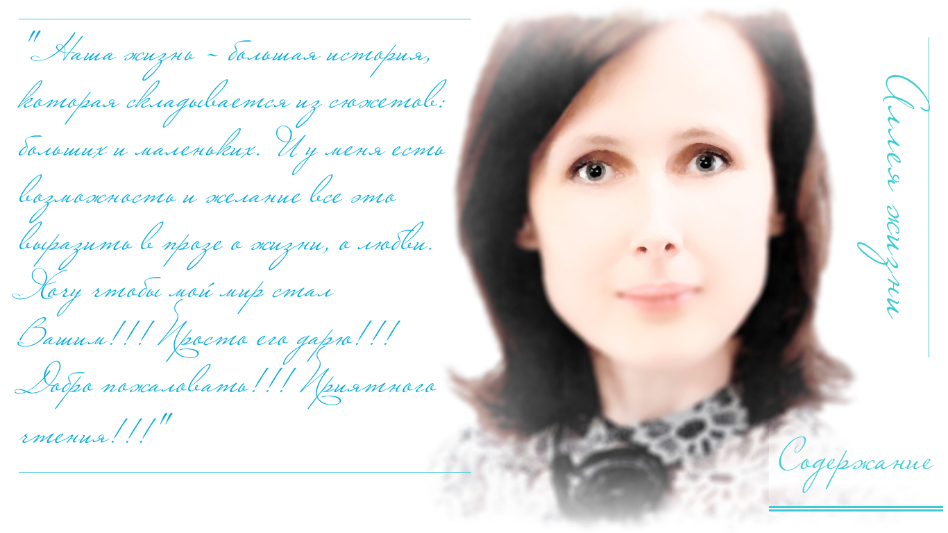 | SEO-описание | Наша жизнь - большая история, которая складывается из сюжетов: больших и маленьких. И у меня есть возможность и желание все это выразить в прозе о жизни, о любви. Хочу чтобы мой мир стал Вашим!!! Просто его дарю!!! |