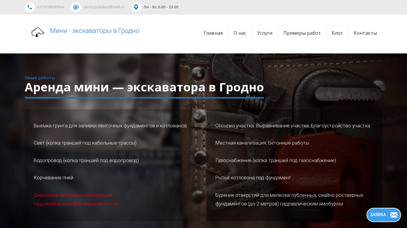 | SEO-описание | Аренда мини экскаватора в Гродно: Услуги мини-экскаватора. Выемка грунта для заливки фундаментов и котлованов. Отсыпка участка. Котлован под дом. Котлован под фундамент. Благоустройство участка. Демонтаж железобетонных конструкций. Гидравлический молот. Аренда гидробура. Корчевание пней экскаватором. Копка траншей под кабельные трассы. |