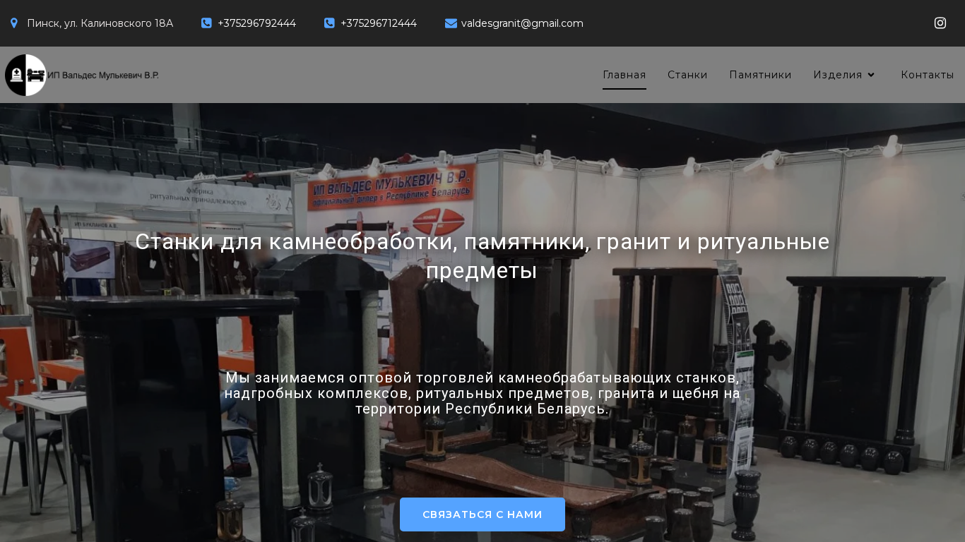 | AI-анализ | The web project "Stanki dlya obrabotki kamnya. Pamyatniki i rituальnye izdeliya" (Machines for processing stone. Monuments and ritual items) is a Belarusian business based in Pinsk, focusing on the sale of stone-working machinery, monuments, and ritual items. The company offers modern equipment for producing and shaping stone products, including cutting, polishing, and rotary molding machines. They also provide design and manufacturing of various types of vertical and horizontal monuments, monuments with sculptures, bas-reliefs, and sell these products to retailers in bulk. In addition, they offer a wide range of ritual items such as vases, lamps, and balls, as well as brick paving, tiles, gravel, and granite. They also manufacture skirting boards. The contact details |