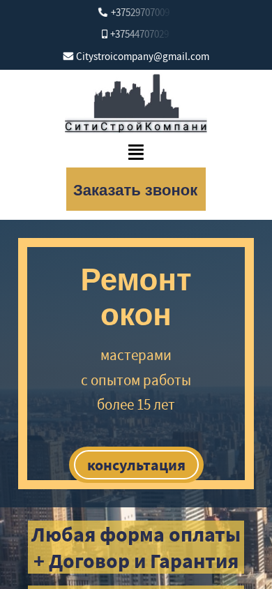 | AI-анализ | The web project "CityStroyCompany" is a window manufacturing company based in Minsk and the surrounding area, offering repair services for PVC windows at low prices. The company guarantees their work and components for up to 60 months. Free dispatch of a surveyor, delivery, and service are included. The website provides information about the services offered, including repair, door repair, window regulation, mosquito nets, and useful information. The company employs experienced professionals for PVC window repair and regulation. The website includes sections for contact information, order a call, and a contract and guarantee. Preliminary orders with a 11% discount are also possible. The company provides services throughout Minsk and the Minsk region. Services include window repair, door repair, window regulation, and the replacement of various parts such as uploniters, fittings, and handles. The website also offers |
