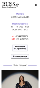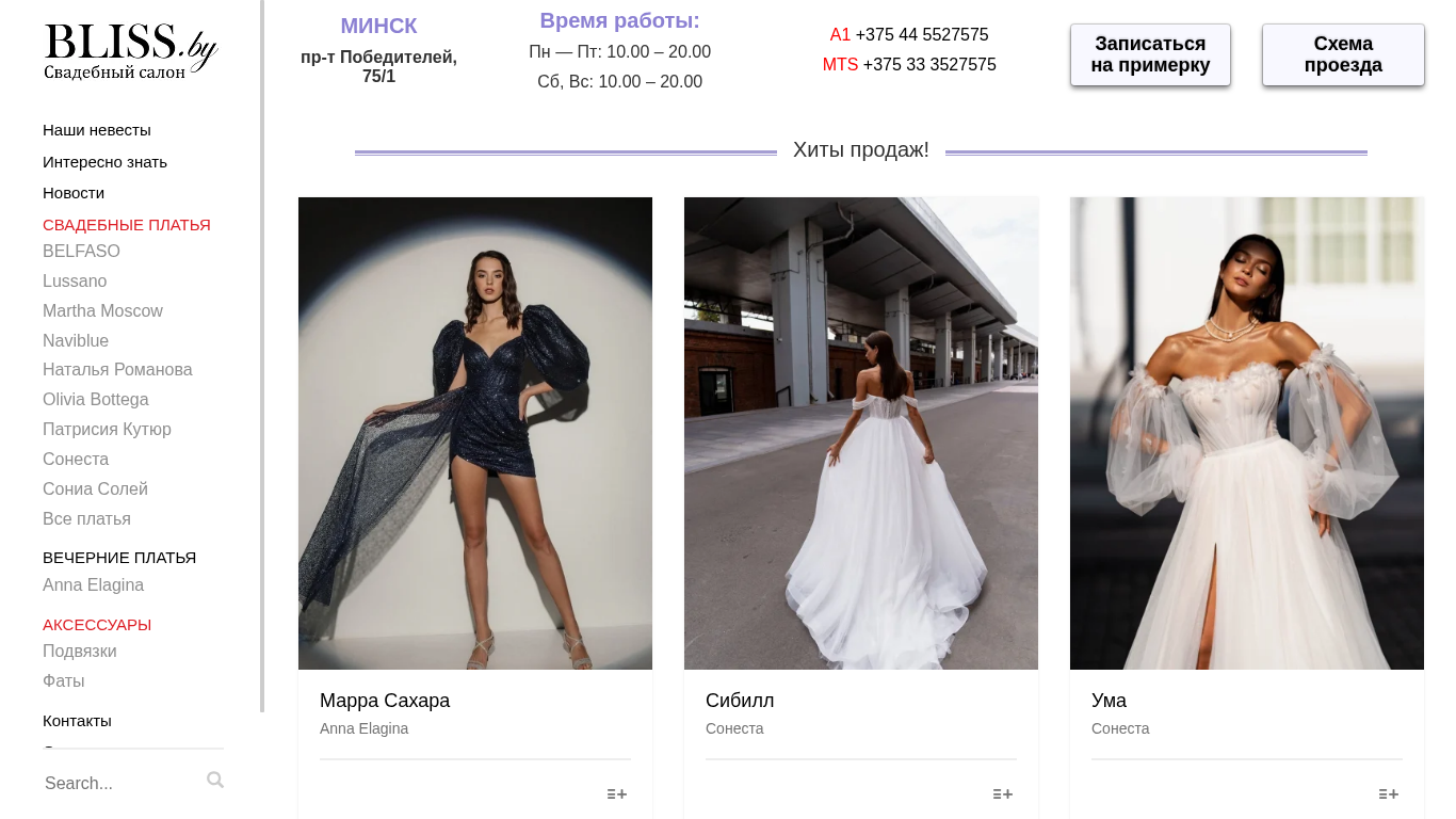 | AI-анализ | --- The web project "Salon Bliss.by" is an online bridal and evening gowns boutique offering both sales and rentals. The extensive collection of original wedding gowns caters to various preferences. Apart from wedding dresses, the inventory includes shoes, jackets, capes, and veils. The boutique's brand partners include BELFASO, Lussano, Martha, Moscow, Naviblue, Natasha Romanova, Olivia Bottega, Patricia Couture, Sonesta, Sonia, and Solley. The store is located in Minsk, Belarus, at Prt. Pobeditelej 75/1. The operating hours are Monday through Friday, 10:00 AM – 8:00 PM, and Saturday and Sunday, 10:00 AM – 8:00 PM |