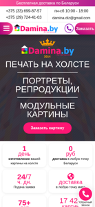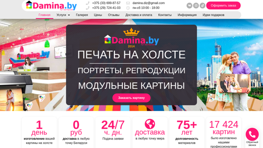 | AI-анализ | language: ru The website Damina.by offers photo and artwork printing on canvas in Belarus. Customers can order at affordable prices and choose from various artistic styles. High-quality materials and shipping within Belarus are assured. Contact information includes phone numbers +375 29 74 41 03 and an email address damina.diz@gmail.com. Operating hours are from Monday to Saturday, 10:00 to 18:00. The website menu includes options for placing an order, information about services, pricing, reviews, delivery and payment, contacts, and ideas for gifts. Services include photo printing on canvas, portraits, art coverings, modular art, frames, gift wrapping, unframed art, posters, and certificates. Free shipping is available within Belarus. |