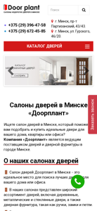 | AI-анализ | --- The web project <title: Салон дверей в Миnске - Купить двери в Минске недорого> is a store for buying doors in Minsk, Belarus. It offers doors for sale both in stock and on order. The website boasts a wide selection of quality door models for homes, with low prices, zero percent financing, and a one-year warranty. Customers can calculate the cost including installation and delivery by contacting +375 29 396-47-58 or +375 29 672-45-85. The store has two locations: one at г. Минск, пр-т Партизанский, 43/43, and the other at г. Минск, ул. Гурского, 46/20. The store |