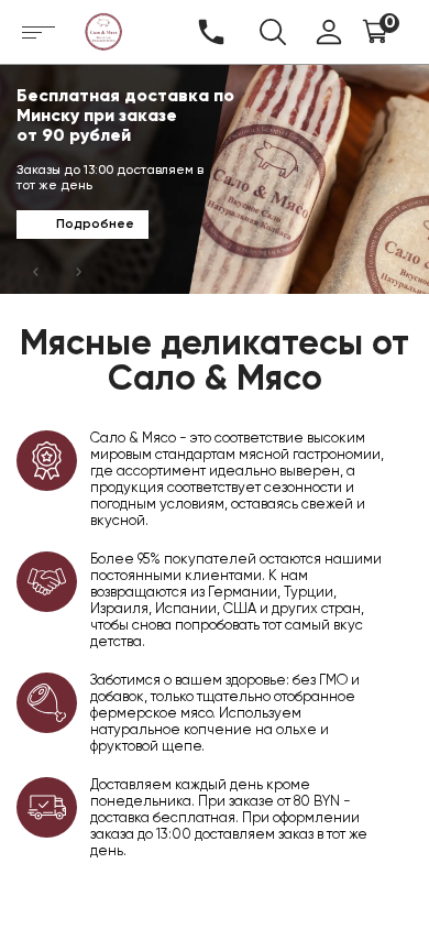 | AI-анализ | --- The website Salo & Miaso is a meat shop located on Komarovka in Minsk, Belarus. It offers delivery of farm-fresh meat products. The shop prioritizes providing exceptional quality meat products in Minsk and accepts orders and self-pickups 24/7. Payment can be made by card. |