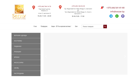 | AI-анализ | --- This website, Sezzar.by, is an online clothing store offering a variety of upper clothing items including jackets, coats, suits, and shirts. The store has multiple physical locations in Minsk, Belarus, including at the Nemiga-3 shopping center and the Jdanovich Trade Center. Contact information for these locations is provided, including addresses and phone numbers. The store offers a bonus system and a return policy. The website is owned and operated by Elena Kapranova, with the legal business name and address listed. The store specializes in men's clothing and has a catalog section featuring categories for coats, jackets, suits, shirts, pants, and accessories. There is also a blog section and a search function. The store offers a promotion of 30% off men's suits. |
