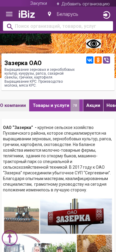 | AI-анализ | The portal Zazerka OAO is a Belarusian agricultural company specializing in the cultivation of grains, legumes, corn, rapeseed, sugar beets, sunflowers, and potatoes, as well as livestock farming. The company operates multiple dairy and cattle farms, calvesheds, and facilities for fattening cattle. Its machinery-tractor park includes specialized and agricultural equipment. In 2017, Zazerka OAO absorbed the loss-making SUP "Sergeevichi". With experienced farmers, qualified specialists, and efficient management, the company's fortunes have improved significantly. Zazerka OAO produces and sells: grains, legumes; rapeseed, sugar beets; sunflowers, potatoes; livestock, including cattle, milk, and meat. The agricultural sector continues to expand its product range, |