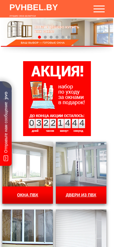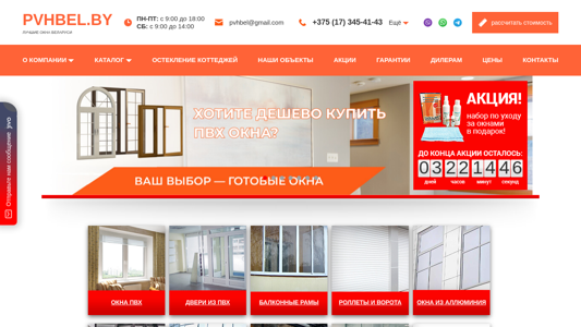 | AI-анализ | --- The portal PVHBEL.BY is a Belarusian e-commerce website specializing in the sale of affordable PVC windows in Minsk. The site offers discounts, financing, and low prices for plastic windows and window sets until September 2025. Customers can also receive gifts with their purchase by placing an order. The company, which has been producing windows for over 10 years, provides information about its products, services, and contacts. The catalog includes windows made of various profiles, such as Rehau, Brusbox, and KBE, as well as aluminum windows, doors, and facade glass installation services. Prices for PVC windows in Minsk are listed, with options for windows of different widths, number of chambers, and thermal conductivity. The site also offers aluminum windows and doors, as well as office partitions and mounting materials |