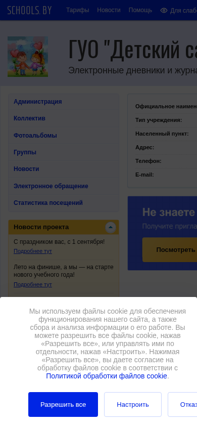 | AI-анализ | --- This online resource, titled "Детский сад №39 г. Мозыря" (Children's School No. 39 in the city of Mozir), utilizes cookies for the proper functioning of the site and data collection and analysis. Users can allow all cookies or manage them individually. The site primarily focuses on children's education, with words like 'детей' (children), 'образования' (education), and 'детский сад' (children's school) appearing frequently. The color scheme of the site is not specified in the provided data. Images are turned off and displayed in black and white. The site contains information about the rules, recommendations, and safety of the daycare institution, as well as a link to learn more. The domain is ds39mozyr.schools.by. |