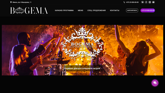 | SEO-описание | Насладись атмосферой в караоке-клубе Bogema на Машерова, 11. Вкусная кухня, качественный сервис, свободный вход. Бронь: 8 029 850-85-85. |