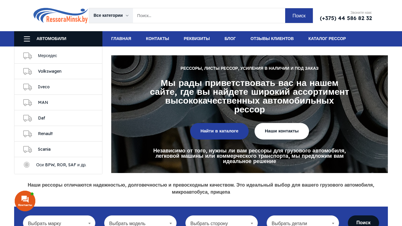 | AI-анализ | --- This website is an online catalog for various types of suspension parts, including reссоры (reссора means suspension in Russian), for trucks, microbuses, trailers, and axles. The available parts are listed under categories such as DAF, Nissan Cabstar, Mercedes Sprinter, and others, with specifications for different vehicle models and years. Users can browse the catalog to find the required suspension part and check its availability in stock or place an order for custom parts. The website also provides details for comparison and specifications for different types of reссора, such as 1-листовая (single-leaf), 2-х листовая (double-leaf), and 3-х листовая (three-leaf) reссора, as well as options for additional reinforcement. The domain name is ressoraminsk.by. |