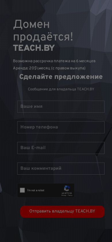 | AI-анализ | This online resource, TEACH.BY, is the official website for an entity related to education. The title of the website is "TEACH.BY," and the description tag indicates it as the official site. The top keywords associated with this domain include "teach," "domain," "прода" (sell), "вся" (all), "возможна" (possible), "рассрочка" (installment payment), "платежа" (payment), "месяцев" (months), "аренда" (rent), "месяц" (month), "правом" (right), "выкупа" (purchase), "сделайте" (make), "предложение" (proposal), "сообщение" (message), "владельца" (owner), "отправить" (send), and "202 |