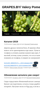 | AI-анализ | This website, GRAPES.BY, is a blog written by Valery Pomelnikov about grapevines and grape cultivation. The main content includes Valery's personal experiences in becoming a grape farmer, descriptions of different grape varieties, and contact information for purchasing grapes or vine cuttings. The blog has a section for news and updates, with the latest post announcing the availability of a new grape catalog for 2019. Valery invites readers to contact him directly to inquire about specific grape varieties and availability, as demand for grapes is high. The website also includes a section for grape care tips and a catalog for download, featuring information on various grape varieties and how to purchase them. The blog is updated regularly, with new content and announcements. |