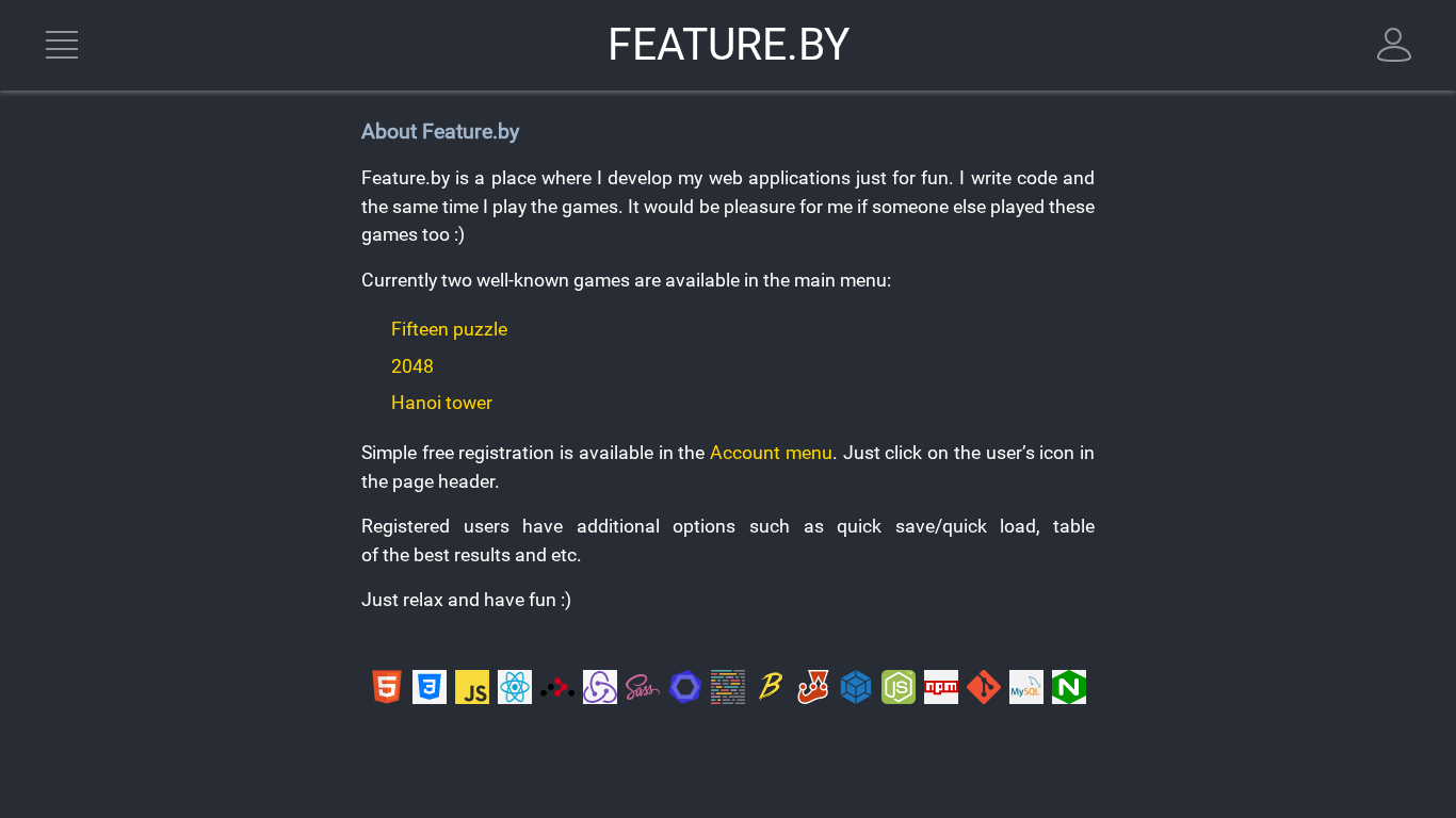 | AI-анализ | The website Feature.by is a personal project by its creator where they develop web applications solely for entertainment purposes. The website runs on create-react-app and requires JavaScript to function. The homepage features a main menu with two games - Fifteen puzzle 2048 and Hanoi tower - available for users to play. Registration is optional and can be done through the Account menu, granting users additional features such as quick save/load options and a table of best results. |