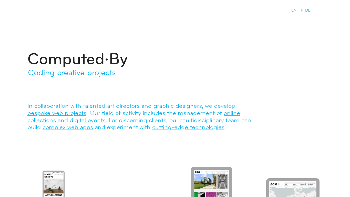 | AI-анализ | type: website language: en The web project Computed·By focuses on coding creative projects for various industries such as art, design, architecture, and scenography. The team collaborates with talented art directors and graphic designers to develop bespoke web projects, manage online collections, and build complex web apps. Their services include web and mobile design, phygital events, teaching and research installations, and experimentation with technologies like AI and NFTs. The company's methodology is based on agility and scalability, with a strong emphasis on digital sustainability through efficient coding, plugin and script optimization, and static rendering on the server-side. All projects are coded and hosted in Switzerland, ensuring data protection and compliance with Swiss laws. |