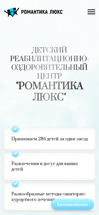 | AI-анализ | --- The web project "Romantica Lux Children's Rehabilitation and Health Resort in Gomel" (romantikalux.by) is a website for a children's rehabilitation and health resort located in Gomel, Belarus. The website provides information about the center's services, accommodations, nutrition, and other facilities. It also includes a page for the psychologist, rules for living, list of responsible personnel, and documents required for admission. The resort accepts 286 children per visit and offers various methods of sanatorium-spa treatment. The organization, which was established in 1990, has undergone several name changes and was most recently certified as a first-category children's sanatorium-spa organization in 2021. The higher educational institution overseeing the organization is the main educational administration of the Homiel O |