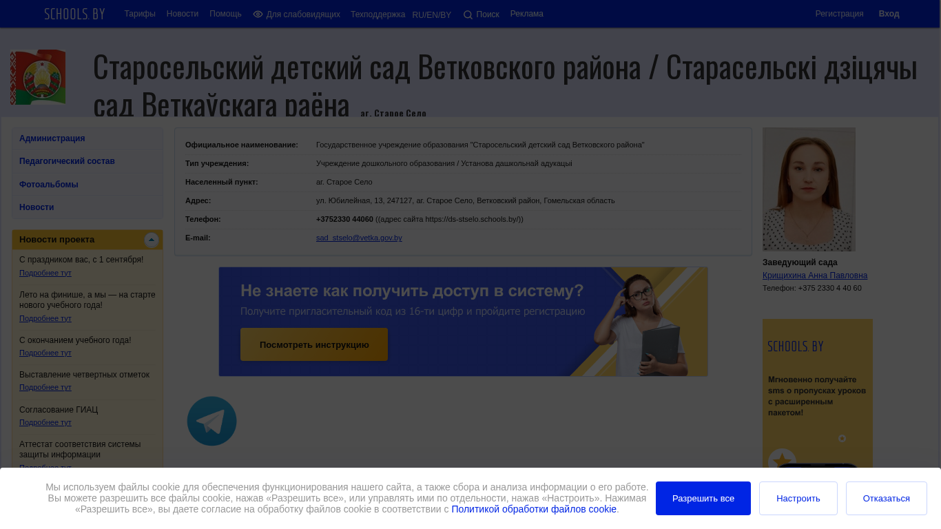 | AI-анализ | The website is a daycare center named Старосельский детский сад (Old Town Children's Garden) located in the Vetkovsky district of Belarus. The website uses cookies for site functionality and data collection and analysis. Visitors can allow all cookies, manage them individually, or reject them. The site is designed in a monochrome color scheme with images turned off. |