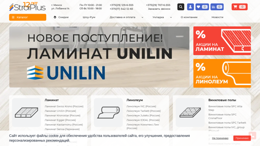 | AI-анализ | The web project "Stroyplus.by" is a store selling floor coverings in Minsk, Belarus. The physical store location is on Lobanka 14 street. Customers can buy various floor coverings, including laminate and linoleum, with options for purchase on credit for up to 12 months. Delivery is available to cities such as Minsk, Gomel, Mohilev, Brest, and other regions of Belarus. The website offers a catalog of floor coverings from various brands including IVC_group, Tarkett, Vinylov, Unilin, Kronostar, Egger, Kastamonu, Sensa, Kronospan, Timber, Tarkett, and others. The site also provides information on installation services for laminate and linoleum. |