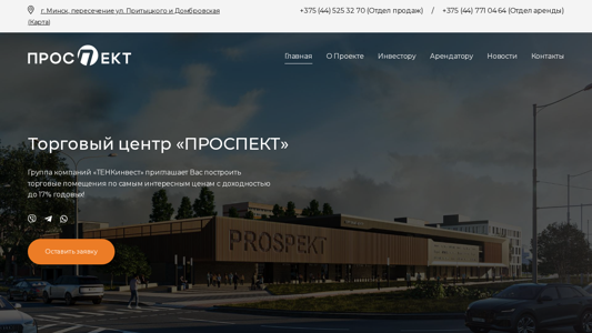 | AI-анализ | The portal Prospekt-Mall.by is a website for a shopping mall in Minsk, Belarus, located at the intersection of Primityzkogo and Dombrovskaya streets (Map). The Group of Companies TENKinvest invites visitors to build retail spaces at attractive prices with a potential yield of up to 17% annually. The project includes a shopping complex of regional scale, with a total area of 26,000 m², featuring two levels of commercial space, 2,000 m² of office spaces, and 500 parking spots. Detailed information about the project is available. Investors and tenants can benefit from favorable location, as the intersection is one of the busiest areas in the capital, with approximately 100,000 vehicles passing through daily. The infrastructure includes nearby office buildings, apartment complexes, |