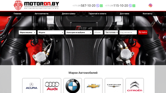 | AI-анализ | The website motoron.by is an e-commerce platform in Belarus that specializes in the sale of used European automotive parts in Minsk. The website offers disassembly services for Skoda, Volkswagen, Audi, Seat, and other brands. Customers can find affordable prices on used automotive parts in Minsk. The website also provides contract engines. The main page includes sections for auto parts, disks and tires, guarantees and payments, contacts, and delivery information. Users can search for parts by brand, model, and category, and select the type of fuel. The site also features a contact form and phone numbers for delivery inquiries. The company has been in business for over five years and offers original used parts from Europe. The site operates on the iDriver.by platform and is open from 10:00-19:00 on weekdays and 10:0 |