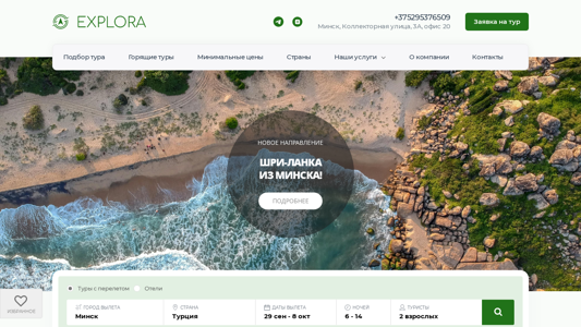 | AI-анализ | --- The website explora.by is a Belarusian travel agency offering tours, cruises, and hotel bookings. It focuses on providing minimal prices for various destinations such as Turkey, Egypt, Shri-Lanaka, China, and others. The website lists specific offers for these countries, including hotels, durations, and costs. Some examples include a 6-night stay in a Shamaz hotel in Shri-Lanka for 4,569 BYN, a 7-night stay in the Marina Spa hotel in China for 3,505 BYN, and a 9-night stay in the Trendy Hotel Palm Beach Adults Only in Turkey for 3,532 BYN. The website also offers tours with direct flights from Minsk to popular destinations such as Sharjah, Hurgada, and Cemer. The contact information for |